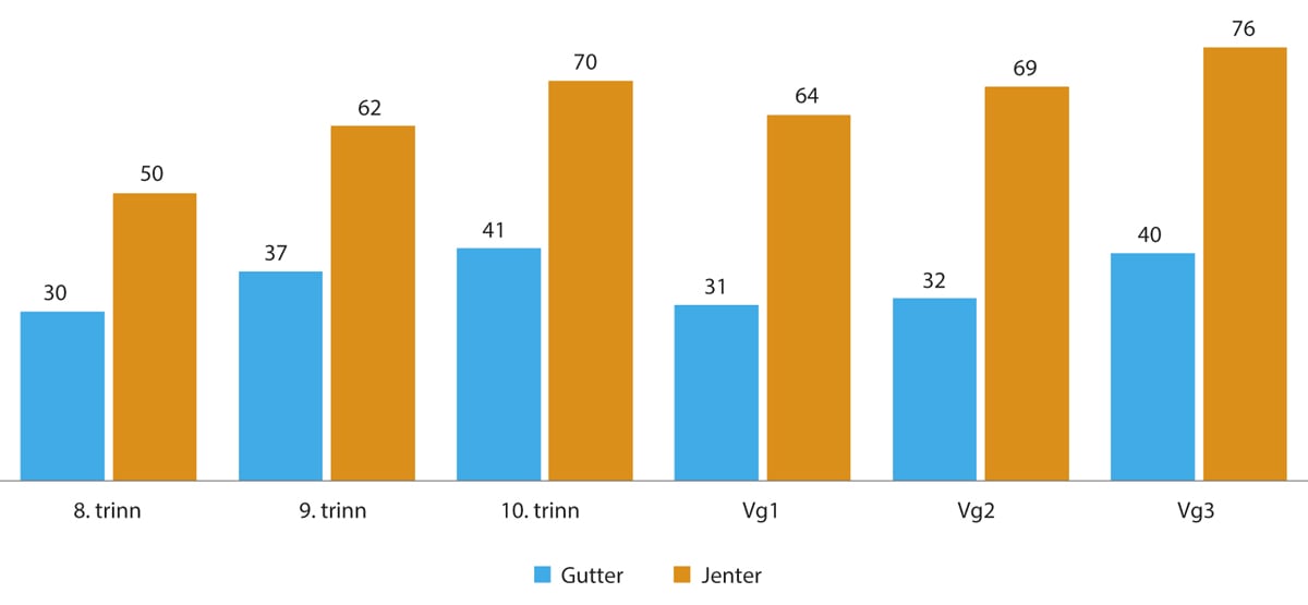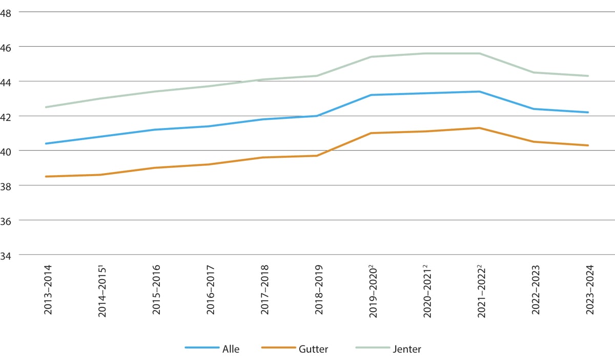 Ulike undersøkelser og statistikker viser at norske jenter har et høyere læringsutbytte enn guttene på flere områder i skolen. Ved avslutningen av grunnskolen gjør jentene det bedre enn guttene på eksamen. Jentene får også bedre standpunktkarakterer i alle fag bortsett fra kroppsøving, og oppnår i gjennomsnitt fire grunnskolepoeng mer enn guttene42, se figur 2.4. Denne forskjellen er noe mindre enn for pandemiårene. Samtidig skårer jentene høyest på en del negative utviklingstrekk. Jentene trives dårligere enn guttene, har større fravær, skulker skolen mer og har flere psykiske plager.
