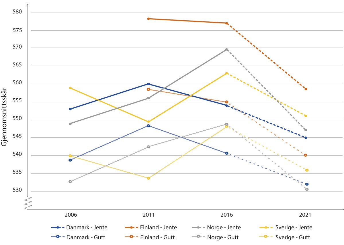 Både på nasjonale prøver og internasjonale undersøkelser har norske jenter over tid skåret betydelig bedre enn guttene i lesing.43 PISA 2022 viste at jentene i snitt skåret 42 skalapoeng høyere enn guttene i lesing, noe som er blant de minste forskjellene målt i perioden Norge har deltatt i PISA-undersøkelsen.44 Store kjønnsforskjeller i lesing er ikke særegent for norske elever, men kjønnsforskjellene mellom norske gutter og jenter er større enn for elever i de fleste andre land vi sammenlikner oss med. Til sammenligning var denne forskjellen i jentenes favør kun 21 poeng i Danmark i 2022, mens den i Sverige var 37 poeng, og i Finland 45 poeng.
