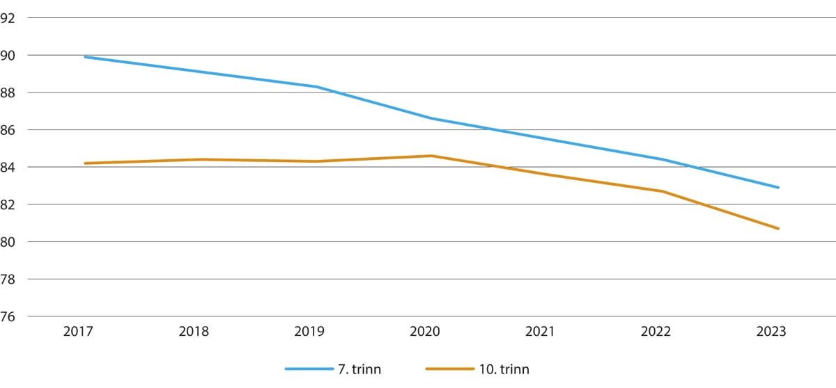 Vi refererer kun til resultatene fra 2022 og 2023 på grunn av bruddet i trendmålingen som kom som følge av ny læreplan og ny analysemetode for beregning av trend.
