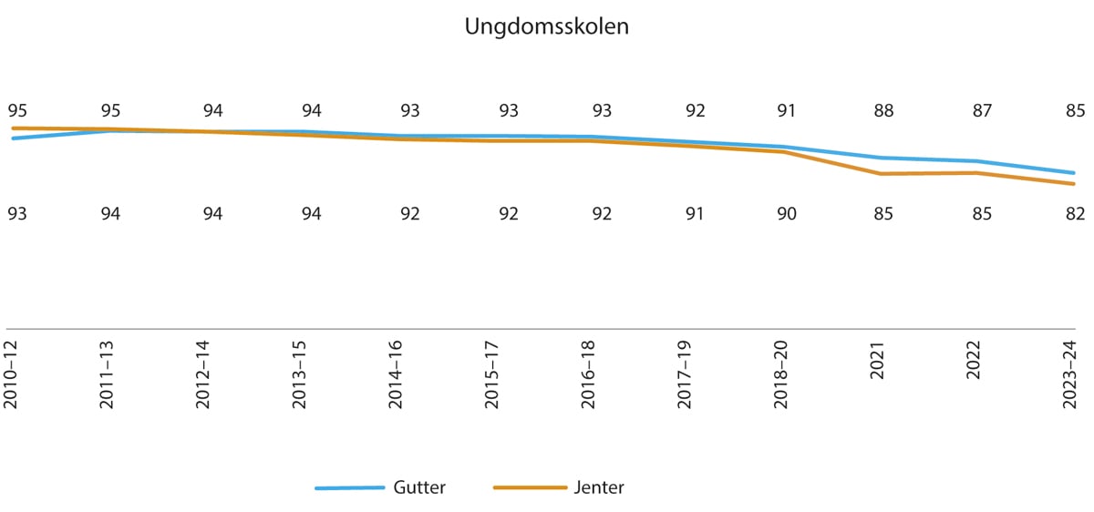 Det har vært en økning i oppnådde grunnskolepoeng over tid. Elever som gikk ut av grunnskolen i 2024 oppnådde i gjennomsnitt 42,2 grunnskolepoeng. 35 Dette er 0,2 poeng lavere enn året før, men omtrent 2 poeng høyere enn avgangselevene i 2014.36 I pandemien gikk resultatene vesentlig opp fra årene før. Dette skyldes trolig en kombinasjon av avlyste eksamener og at lærerne endret vurderingspraksis. Både elever, lærere og skoleledere rapporterer om læringstap under pandemien til tross for at standpunktkarakterene økte.37