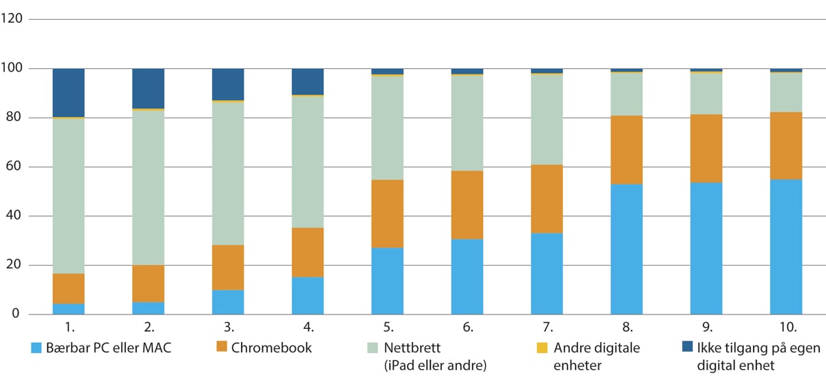 TIMSS 2019 viste stabilt gode resultater i matematikk og naturfag på barnetrinnet, men en signifikant nedgang i resultatene på ungdomstrinnet.26 PIRLS 2021 viste for første gang en nedgang i 10-åringenes leseferdigheter. Resultatene var likevel godt over det internasjonale gjennomsnittet. Norske tiåringer rapporterte om lavest leseglede av samtlige land i undersøkelsen.27 PIRLS 2021 viste også en markant økning i bruk av digitale enheter i skolen fra 2016–2021.