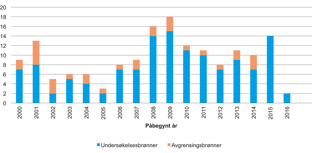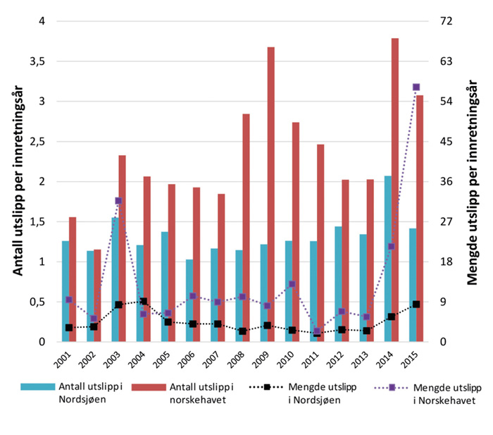 Det er en nedgang i antall inntrufne akutte utslipp av råolje og tilløpshendelser som kunne gitt akutte råoljeutslipp om flere barrierer hadde sviktet. Ingen av disse utslippene er større enn 4 400 kubikkmeter. Antall akutte råoljeutslipp og samlet utslippsmengde i Norskehavet for perioden 2001–2015 er vist i figur 5.10.