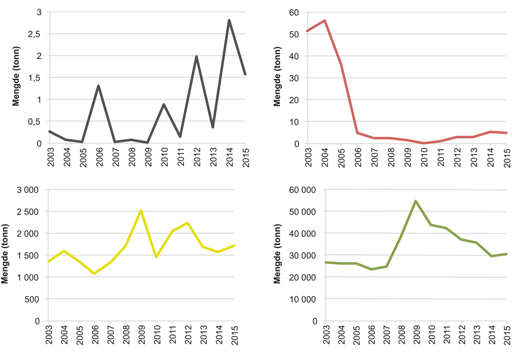 Av akutte utslipp er kjemikalier den klart dominerende utslippstypen på norsk sokkel. Akutte kjemikalieutslipp utgjør 80 % av alle akutte utslipp med utslippsmengde over 1 kubikkmeter. Antallet hendelser og hendelsenes samlede utslippsmengde har vært relativt stabilt over tid (figur 5.11). Det har i tillegg vært flere hendelser med lekkasjer fra injeksjonsbrønner. Økningen i antall akutte utslipp av kjemikalier i 2014 og 2015 kan forklares med en regelverkspresisering og endret rapportering. Økningen i årlig utslippsmengde skyldes akutte kjemikalieutslipp med stor utslippsmengde, og ikke regelverkspresiseringen.