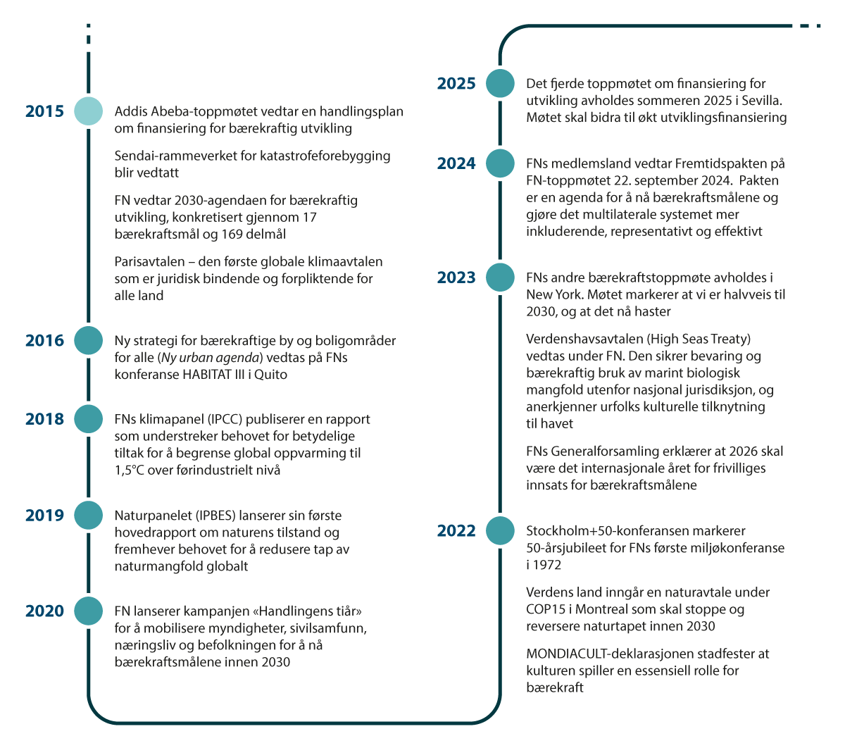 Toppmøteerklæringen med 2030-agendaen for bærekraftig utvikling ble vedtatt på FNs generalforsamling i 2015, med tilslutning fra alle de 193 medlemslandene. Den består av 17 bærekraftsmål og 169 delmål. Bærekraftsmålene er universelle og forplikter alle land – uavhengig av utviklingsnivå – til å arbeide for en bærekraftig utvikling gjennom samstemt, helhetlig og langsiktig arbeid globalt, nasjonalt og lokalt.