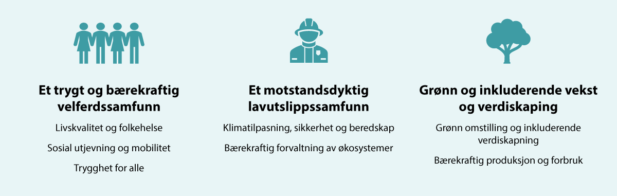 Norge kjennetegnes av relativt små sosiale og økonomiske forskjeller, en sterk økonomi og velferdsstat, samt velfungerende juridiske og demokratiske institusjoner. Dette gir et godt utgangspunkt, og bidrar til at vi ligger langt framme i arbeidet med bærekraftsmålene. Likevel står vi overfor vesentlige utfordringer, særlig innen områder hvor levestandarden vår fører til et høyt ressursforbruk med betydelige klimaavtrykk.