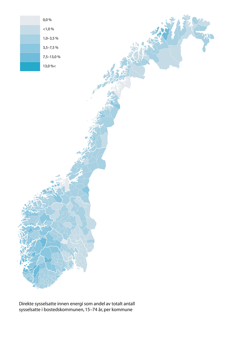 Figur 2.4 Sysselsetting i energisektoren, direkte sysselsatte som andel av totalt antall sysselsatte i bostedskommunen.