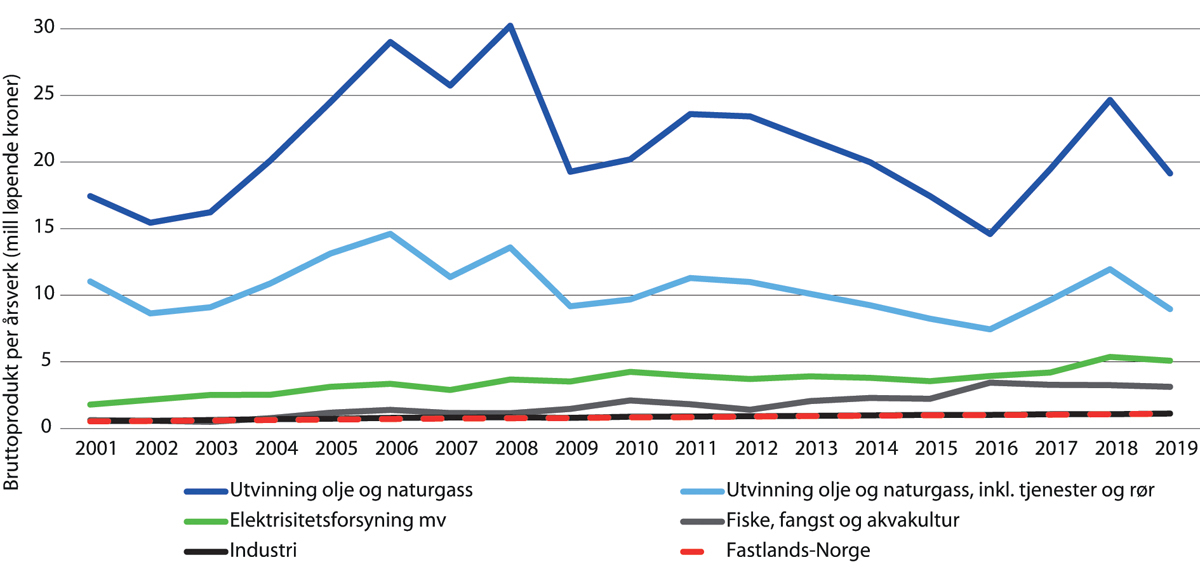 Figur 2.5 Verdiskaping i ulike sektorer per årsverk (heltidsekvivalenter).