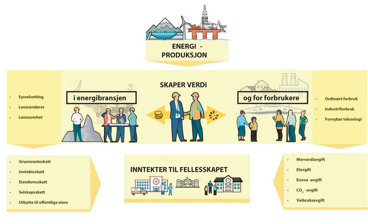 Den samlede verdiskapingen fra norske energiressurser, og dens betydning for norsk økonomi, er omfattende. De ulike delene av energisektoren er direkte og indirekte knyttet til en rekke andre næringer, som leverandører i industri og tjenesteytende næringer. I tillegg legger energisektoren grunnlag for all næringsvirksomhet og aktivitet innenlands, gjennom å sikre tilgang på elektrisitet og andre energivarer i alle deler av landet.