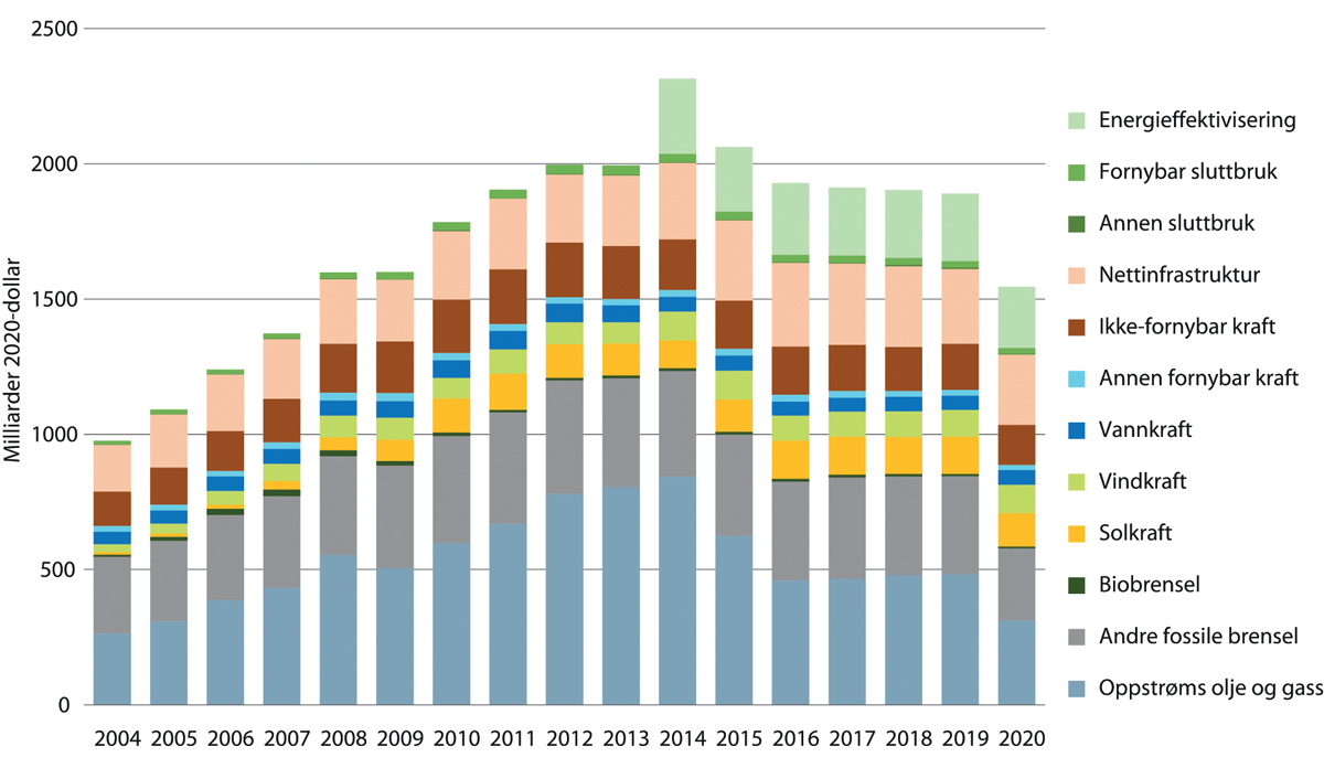 I 2020 ble det ifølge IEA investert om lag 300 mrd. dollar globalt innen oppstrøm olje og gass, jf. figur 2.8. Også innen fornybar kraft ble det investert om lag 300 mrd. dollar i 2020, hvorav solkraft utgjorde den største andelen etterfulgt av investeringer i vindkraft. I tillegg ble det investert over 200 mrd. dollar i energieffektivisering og om lag 260 mrd. dollar i nettinfrastruktur.