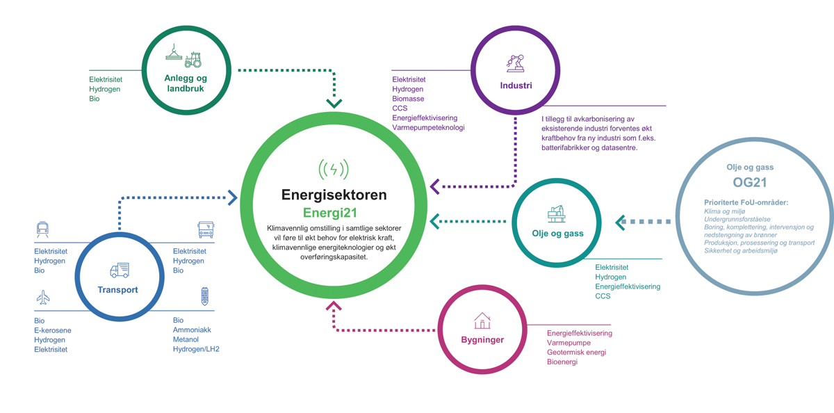 Figur 2.9 Satsingen på forskning og innovasjon skal legge grunnlaget for mer effektiv, lønnsom og klima-og miljøvennlig utnyttelse av de norske energiressursene knyttet til produksjon, overføring og bruk. Med FoU-strategiene Energi21 og OG21 i bunn, vil myndighetenes FoU-innsats være rettet mot nye teknologier, løsninger og kunnskap for et stadig mer digitalisert og integrert energisystem, som vil ha stor betydning for framtidig forsyningssikkerhet, integrasjon av klimavennlige energiteknologier og samfunnets verdiskaping. Figuren illustrerer dette og peker på sentrale teknologiområder som vil inngå i en framtidig utvikling av energiløsninger innenfor viktige samfunnssektorer som transport, industri, bygg, anlegg, og olje og gass.