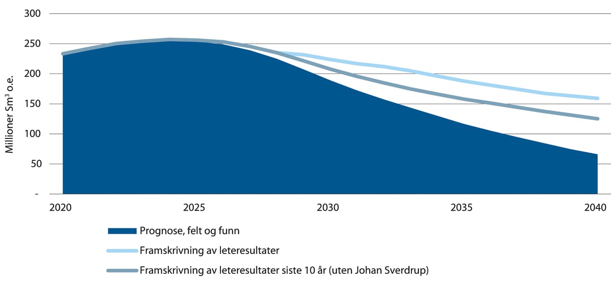 Oljedirektoratet har i sin siste ressursrapport illustrert mulig produksjon utover 2030. Det er da lagt til grunn dagens anslag for forventet, framtidig produksjon fra dagens påviste felt og funn samt at produksjonen fra framtidig leting blir lik den som i dag forventes komme fra letingen det siste tiåret. Produksjonsbanen er illustrert både uten og med et stort overraskende funn, slik en opplevde i siste tiårsperiode (Sverdrup-feltet), jf. figur 5.10. Med disse forutsetningene vil produksjonen gradvis avta over tid og i 2040 være mellom 30 og 45 pst. under nivået i 2020 avhengig av om en også framover gjør et overraskende funn eller ikke. Uten nye funn indikerer anslaget et fall på over 70 pst. fram mot 2040.