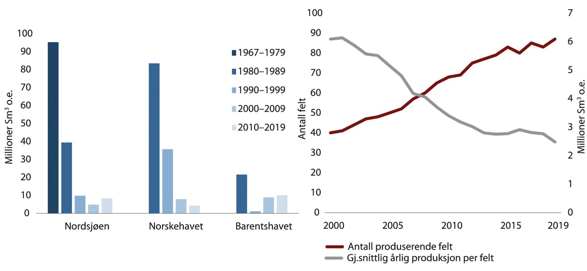 Gjennomsnittlig funnstørrelse på norsk sokkel har blitt lavere over tid i tråd med modningen av sokkelen. Mange av de mindre funnene som er gjort på norsk kontinentalsokkel de siste tiårene er bygd ut ved tilkobling til eksisterende infrastruktur. Få felt er til nå stengt ned. Dette har gjort at antallet produserende felt på norsk kontinentalsokkel har økt kraftig over tid. I tillegg er mange av de store feltene nå i en moden fase med lav produksjon sammenlignet med toppnivået fra tidligere i levetiden. Sammen gjør disse to forholdene at gjennomsnittlig årlig produksjon per felt er redusert betydelig over tid, jf. figur 5.12.
