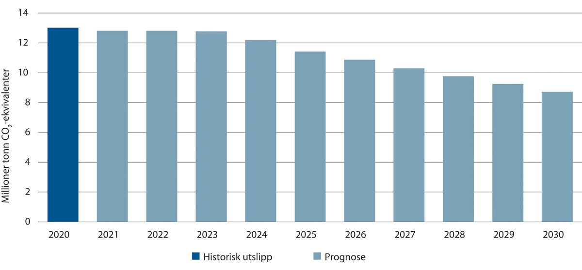 Oljedirektoratet lager langsiktige framskrivinger av produksjonen ut fra sitt estimerte ressursgrunnlag for norsk sokkel. I basisalternativet, gjengitt i Perspektivmeldingen 2021, legges det til grunn en markert nedgang i norsk olje- og gassproduksjon på lang sikt. Over tid anslås produksjonen å falle gradvis med anslagsvis 65 pst. fra 2020 til 2050, i takt med en gradvis nedgang i gjenværende utvinnbare ressurser som følge av produksjonen i perioden. Anslått nivå på gjenværende ressurser i basisalternativet faller da fra om lag 50 pst. i dag til i underkant av 20 pst. i løpet av de neste to tiårene. Det vil alltid være stor usikkerhet knyttet til langsiktige produksjonsanslag. Usikkerheten i anslag for produksjonen fra ikke-påviste ressurser er i sin natur betydelig større enn for påviste ressurser. Framtidige leteresultater vil være avgjørende for produksjonsnivået på lang sikt sammen med en rekke andre faktorer. Dette innebærer at usikkerheten knyttet til framtidig produksjon øker betydelig utover i tid, og at slike anslag vil være nært knyttet til hvilke forutsetninger som en legger til grunn ved utarbeidelse av anslagene.