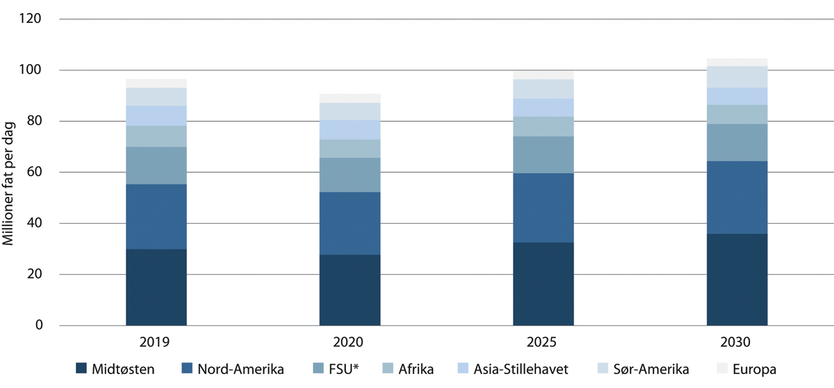 Totalproduksjonen på norsk kontinentalsokkel øker de nærmeste årene, i all hovedsak på grunn av oppstarten av Sverdrup-feltet, jf. figur 5.9. Denne økningen forventes etterfulgt av en gradvis nedgang i produksjonen fra norsk sokkel fra midten av 2020-tallet. Den største andelen av produksjonen på norsk kontinentalsokkel kommer fra Nordsjøen, men også produksjonen fra Norskehavet er betydelig. Produksjonen i Barentshavet er vesentlig lavere, men funn fra 2011-2020 utgjør en økende andel av produksjon gjennom 2020-tallet.