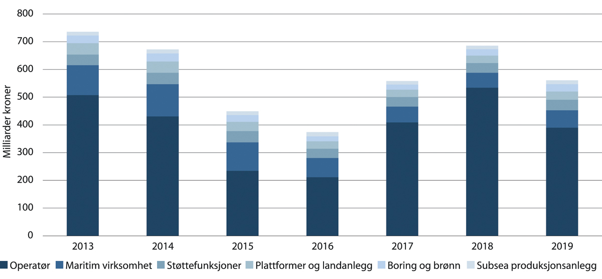 De siste årene har totale investeringer innen petroleumssektoren stått for om lag 20 pst. av totale investeringer i fast realkapital i Norge. Disse investeringene samt løpende drift av felt og landanlegg fører til stor etterspørsel etter varer og tjenester. Denne etterspørselen utgjør er et stort marked for norskbasert leverandørindustri, og er en grunn til at det er om lag 200 000 sysselsatte personer som kan knyttes direkte og indirekte til petroleumsnæringen.