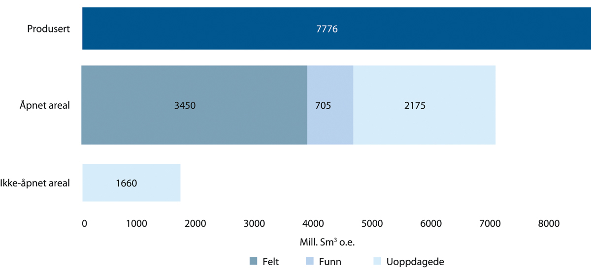 Oljedirektoratets årlige ressursregnskap for 2020, viser at om lag halvparten av forventede utvinnbare ressurser er produsert til nå, at 22 pst. ligger i dagens felt, mens om lag fem pst. ligger i påviste funn, jf. figur 5.4. De resterende 24 pst. er anslått fortsatt å være uoppdagede. Disse er fordelt mellom områder som er åpnet for petroleumsvirksomhet samt områder som ikke er åpnet, men der direktoratet har gjennomført en kartlegging som gir grunnlag for å estimere ressursene. Om lag 43 pst. av direktoratets anslåtte, uoppdagede ressursene ligger i areal som ikke er åpnet for petroleumsvirksomhet.