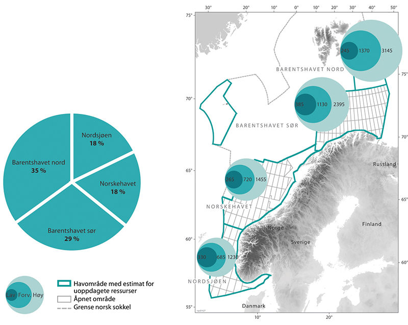 ODs ressursestimat er basert på kjent kunnskap om undergrunnen. Det er ikke mulig å vite hvilke tilstedeværende ressurser som er i et område uten at det er åpnet og det blir gjennomført leteboring. Det vil alltid være betydelig usikkerhet i slike ressursestimater – særlig stor vil den være for områder uten letehistorikk. For å illustrere usikkerhetsspennet utfylles forventningsestimatet for uoppdagede ressurser, med estimering av både en nedside og en oppside, jf. figur 5.5. Den begrensede kunnskapen om undergrunnen gjør at slike estimater er svært avhengig av de usikre forutsetninger som må gjøres ved estimeringen. Ressursgrunnlaget kan være både mindre og høyere enn det estimerte. Hvis en leteboring i et område eksempelvis bekrefter en letemodell med stort ressurspotensial vil ressursanslaget kunne øke betydelig. Det største ressurspotensialet for uoppdagede ressurser ligger i Barentshavet, inkludert i havområder som ikke er åpnet for petroleumsvirksomhet.