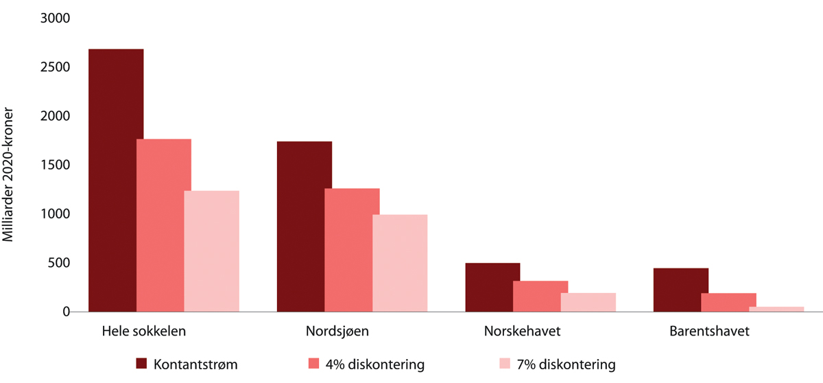 Oljedirektoratet har i sin siste ressursrapport beregnet lønnsomheten av leting på norsk sokkel fra år 2000 til 2019. Verdianslaget er beregnet med ulike diskonteringsrenter. Netto nåverdi er anslått til vel 1 200 mrd. kroner med en reell diskonteringsrente på syv pst. Samlet udiskontert netto kontantstrøm er anslått til nærmere 2 700 mrd. kroner, jf. figur 5.7. Videre viser analysen at letevirksomheten har vært mer lønnsom de siste ti årene enn i forrige tiårsperiode, og at alle havområdene bidrar til den samlede verdiskapingen.