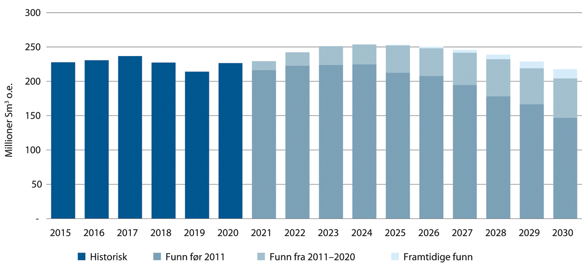 De nærmeste årene ventes produksjonen hovedsakelig å komme fra allerede produserende felt og felt som i dag er under utbygging. Fram mot 2030 vil fortsatt funn gjort før 2011 stå for størstedelen av ventet produksjon. I 2030 anslås seks pst. av produksjonen å komme fra framtidige funn, en andel som forventes å øke utover i tid.