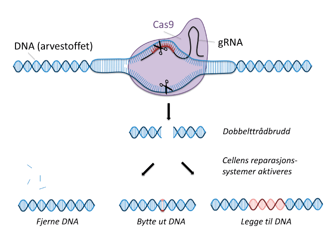Ved CRISPR/Cas9 brukes bakterier for å klippe og lime i DNA. Enzymet Cas9 guides av et spesielt RNA-molekyl (gRNA), som binder seg til en matchende sekvens i cellens DNA. Cas9 kutter så begge DNA-trådene. Bruddet kan så repareres av andre enzymer, for eksempel ved å sette inn spesialdesignet DNA. Se også boks 6.1.