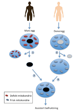I metoden som kalles «Maternell spindeloverføring» fjernes cellekjernen som inneholder donors genomiske DNA fra den friske eggcellen, så overføres bare kjernematerialet (cellekjernen) fra pasientens eggcelle til givers egg (dvs. at de «syke» mitokondriene ikke overføres), og dette egget befruktes, se figur nedenfor.