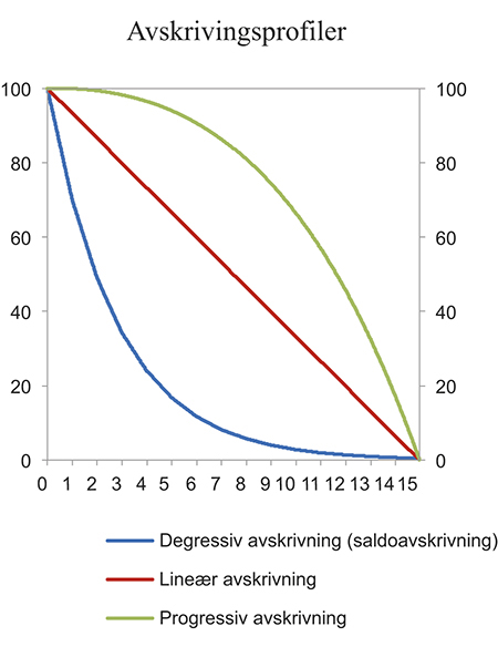Figur 10.1 viser profilen på den skattemessige verdien over tid for et driftsmiddel med en investeringsutgift på 100 ved ulike avskrivningsprofiler. Figuren illustrerer at for et driftsmiddel som faller betydelig i verdi de første årene, kan saldoavskrivninger være en god tilnærming til faktisk økonomisk verdifall. Store reduksjoner i avskrivningsgrunnlaget de første årene innebærer imidlertid også at avskrivningene blir relativt mindre verdt de senere årene. Progressiv avskrivning (konkav funksjon) kan for eksempel passe godt for produksjonsprosesser der en maskin genererer om lag samme inntekt helt fram til den må skiftes ut. På samme måte som i et degressivt system kan en utforme progressiviteten i avskrivningene på mange ulike måter.