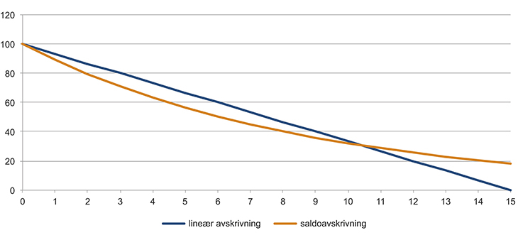 Figur 10.2 viser utvikling i skattemessig verdi for samme investering med lineær avskrivning og saldoavskrivning, der nåverdien av avskrivningene er den samme. Her er det forutsatt en diskonteringsrente på 10 pst. og en lineær avskrivning over 15 år.