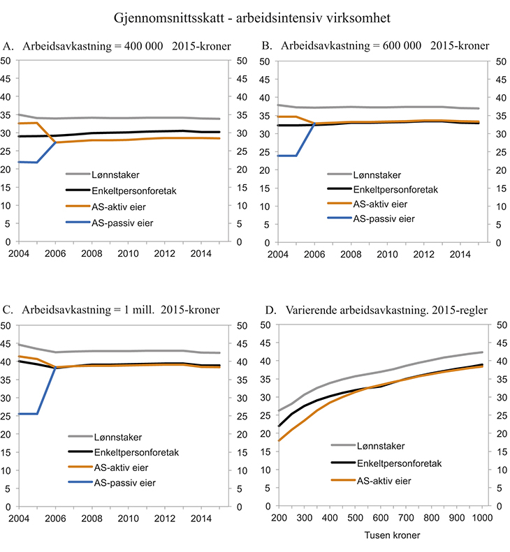 Figur 7.1 illustrerer beregnet gjennomsnittsskatt i perioden 2004–2015 for lønnstakere og næringsdrivende med en arbeidsintensiv virksomhet organisert som henholdsvis enkeltpersonforetak og aksjeselskap. Beregningene viser gjennomsnittsskatt ved en arbeidsavkastning på 400 000 kroner, 600 000 kroner og 1 mill. kroner. Figuren viser også hvordan gjennomsnittsskatten for 2015 avhenger av inntekten.