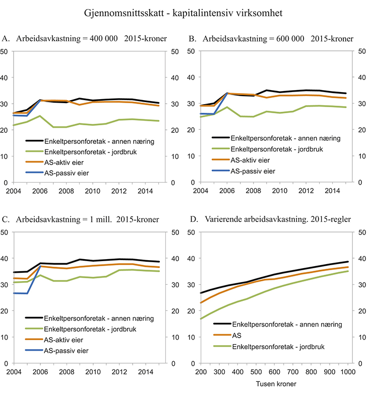 I figurene 7.1 og 7.2 vises eksempelberegninger av gjennomsnittsskatt for ulike virksomhetsformer for perioden 2004–2015. I eksemplene er det beregnet samlet skatt på arbeids- og kapitalavkastningen, dvs. at skatten inkluderer arbeidsgiveravgift og selskapsskatt der det er relevant. Formuesskatt er også inkludert. Det er ingen ansatte, og eksemplene inkluderer dermed ikke det særskilte lønnsfradraget for enkeltpersonforetak med ansatte. Det særskilte lønnsfradraget ble avviklet fra og med 2012. Det forutsettes driftsutgifter utenom lønn på 50 000 kroner. Det legges til grunn at den aktive aksjonæren i eksemplet med aksjeselskap tilpasser fordelingen av lønn og utbytte slik at minst mulig betales i skatt, det vil si at skattebesparelse vektlegges høyere enn opptjening av rettigheter i folketrygden. For eksempel tar den aktive aksjonæren ut lønn inntil trinn 1 i toppskatten før eventuelt overskudd utover skjerming tas ut som utbytte. For øvrig er det to grupper av eksempler: