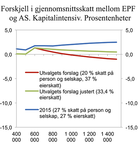 Figur 7.4 Forskjell i gjennomsnittsskatt mellom enkeltpersonforetak og aktiv eier i aksjeselskap etter størrelsen på arbeidsavkastningen. Kapitalintensiv virksomhet. Positivt tall betyr at enkeltpersonforetaket betaler høyest skatt. Negativt tall betyr at aktiv eier i aksjeselskap betaler høyest skatt. Prosentenheter