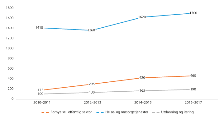 I perioden 2015–18 styrket regjeringen den langsiktige prioriteringen for offentlig sektor med om lag 210 mill. kroner. Den målrettede innsatsen på området i Forskningsrådet i 2017 var 725 mill. kroner. Medregnet innsatsen i programmer og aktiviteter som ikke direkte er knyttet til prioriteringen, men som likevel er relevante for den, er totalen langt større, jf. figur 5.1.