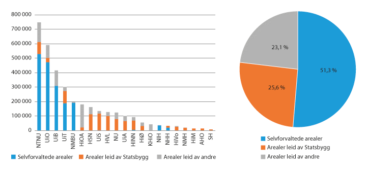 Statlige universiteter og høyskoler disponerer et samlet areal på om lag 3,4 mill. kvadratmeter. Den største delen av dette er statlig eiendom som forvaltes av institusjonene selv (halvparten). En fjerdedel forvaltes av Statsbygg, og en fjerdedel av arealet leies i det private markedet. Etter strukturreformen har de fleste institusjonene arealer i alle kategoriene. Selvforvaltet areal innebærer at institusjonene har ansvar for å forvalte, vedlikeholde og drifte arealet selv. Syv institusjoner, Universitetet i Oslo (UiO), Universitetet i Tromsø – Norges arktiske universitet (UiT), Universitetet i Bergen (UiB), Norges teknisk-naturvitenskapelige universitet (NTNU), Norges miljø- og biovitenskapelige universitet (NMBU), Norges handelshøyskole (NHH) og Norges idrettshøgskole (NIH), omtales som selvforvaltende institusjoner fordi de har en overvekt av selvforvaltet areal.5 Bygg forvaltet av Statsbygg inngår i statens husleieordning, en ordning der institusjonene betaler kostnadsdekkende husleie. Husleien dekker forvaltning, drift og verdibevarende vedlikehold, samt en fastsatt avkastning på investert kapital.