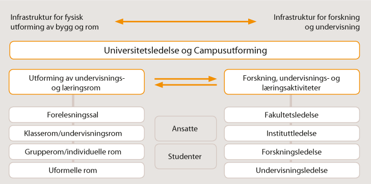Utvikling av undervisnings- og læringspraksis må samordnes med utformingen av undervisnings- og læringsrom slik at studentene trives, lærer det de skal, fullfører og får optimalt læringsutbytte. Campusutvikling er en del av organisasjonsutviklingen og krever ledelsesforankring og eierskap til omstillingsprosessene i alle ledd i organisasjonen. Figur 8.3 illustrerer sammenhengen mellom organisering og fysisk utforming av bygg og rom.
