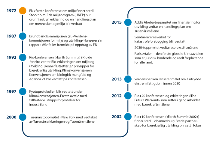 Utvikling og fattigdomsbekjempelse har vært en sentral oppgave for FN siden opprettelsen i 1946. På Stockholm-konferansen i 1972 ble miljø satt på den globale dagsorden. Basert på rapporten som Brundtlandkommisjonen la frem i 1987, ble bærekraftig utvikling satt på agendaen på Rio-toppmøtet i 1992. Tusenårsmålene ble vedtatt i år 2000, med fattigdomsbekjempelse som det overordnede målet.