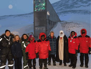 Figur 1.4 Statsminister Erna Solberg og president Nana Addo Dankwa Akufo-Addo sammen med medlemmer av FNs pådrivergruppe og partnere som drifter Svalbard globale frøhvelv, februar 2020.