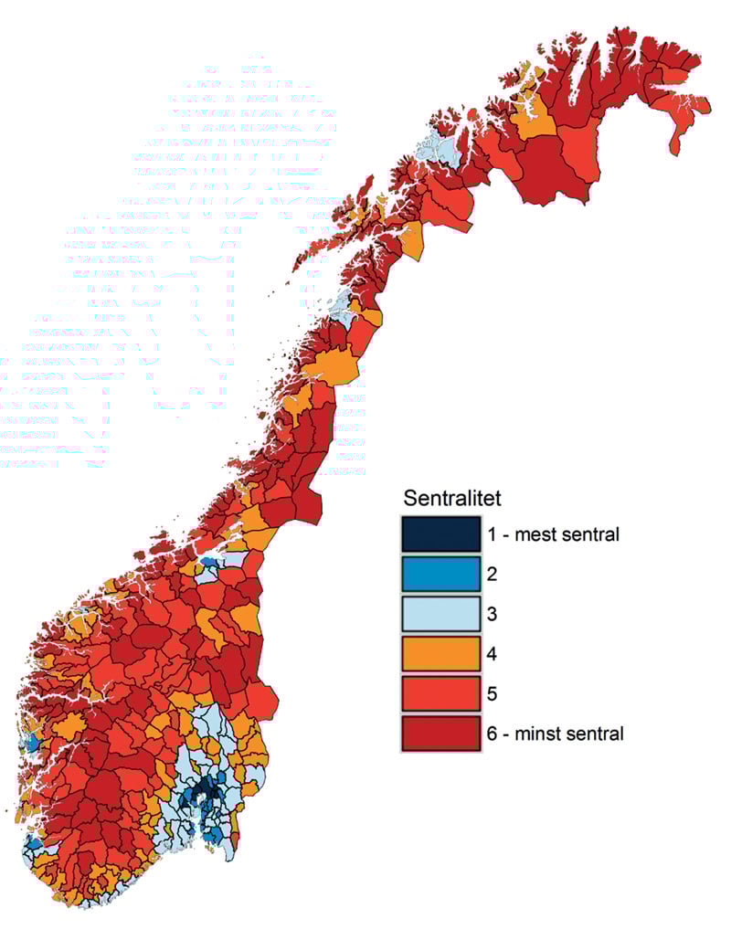 I SSBs sentralitetsindeks fra 2017 blir alle kommuner rangert etter befolkningens tilgang til arbeidsplasser og private og offentlige tjenester.1 Indeksen gir et oppdatert og presist bilde av bosettingsmønster og arbeidsplass- og tjenestekonsentrasjoner i Norge.