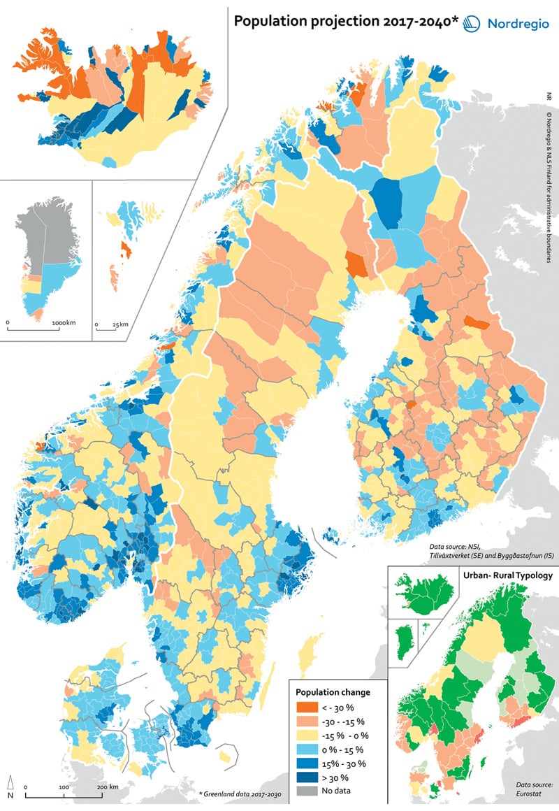 Figur 3.2 viser befolkningsframskrivinger i Norden i perioden 2017–2040, der SSBs framskrivninger fra 2018 inngår som tallgrunnlag. De blå feltene markerer områder med antatt befolkningsvekst. Kartet synliggjør at det norske bosettingsmønsteret er relativt unikt også i Norden. Det kan forstås som et uttrykk for at økonomisk aktivitet i Norge er mer distribuert enn i våre naboland.