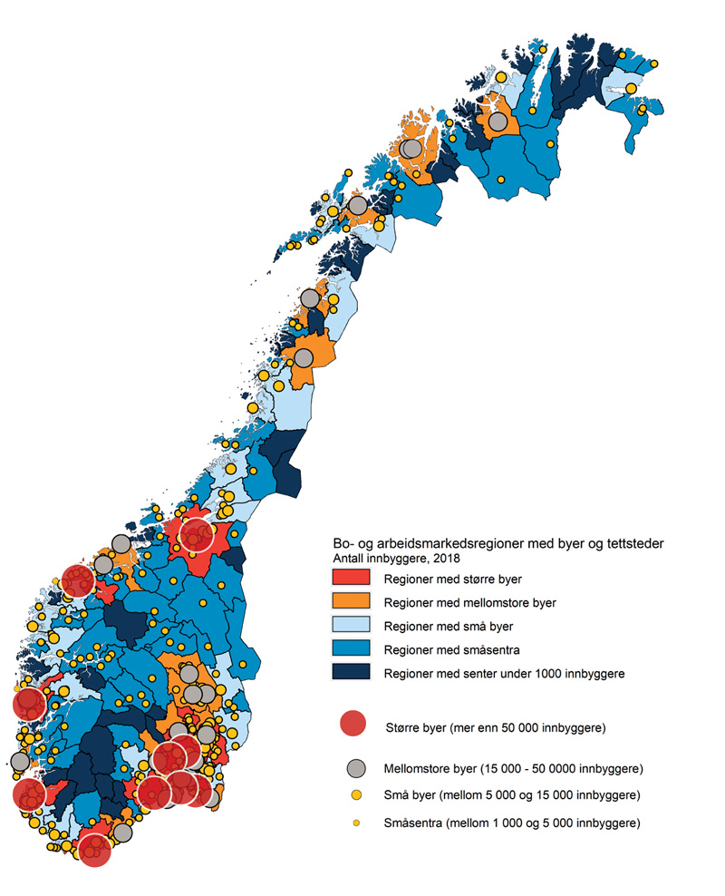 Figur 3.3 Bo- og arbeidsmarkedsregioner etter størrelse på største by eller senter i regionen
