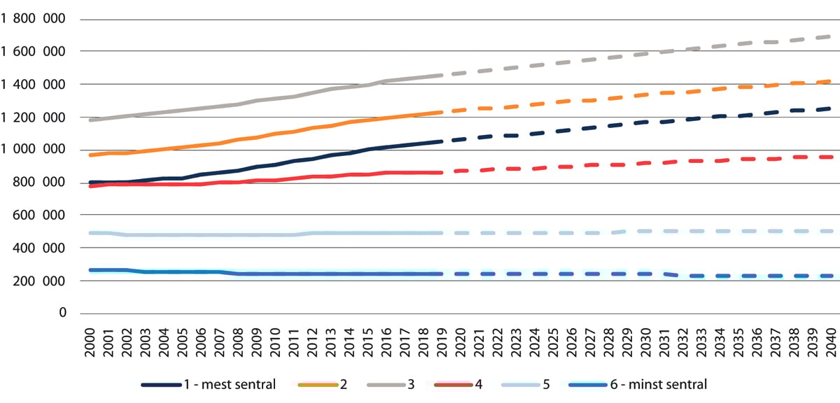 Debatten om distriktene handler ofte om fraflytting. Dette er til dels en unyansert framstilling. Det vil med stor sannsynlighet fortsatt være spredt bosetting i Norge i overskuelig framtid, men med en svak nedgang på sentralitet 6, jf. Figur 3.4. Med SSBs hovedalternativ anslås det at det vil bo i underkant av 740 000 personer i områder med lav sentralitet (5 og 6) i 2040 (beregninger KMD).