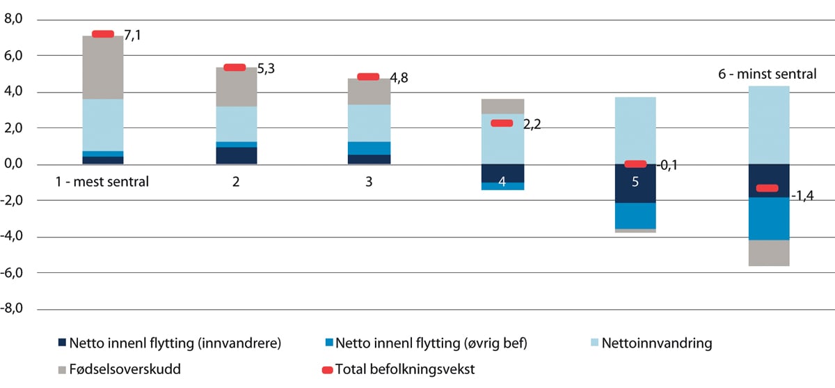Det betyr at befolkningsveksten skjer først og fremst i sentrale områder (sentralitet 1 og 2), hovedsakelig på grunn av fødselsoverskudd og innvandring, jf. figur 2.5. Det er verdt å merke seg at den innenlandske flyttingen til disse områdene i sum er relativt liten. Mange unge flytter til storbyer i forbindelse med studier og jobb, og etablerer seg siden i omlandskommunene til storbyene eller i mellomstore byregioner (sentralitet 3). Mye av den innenlandske flyttingen er også relatert til innvandrerbefolkningen.