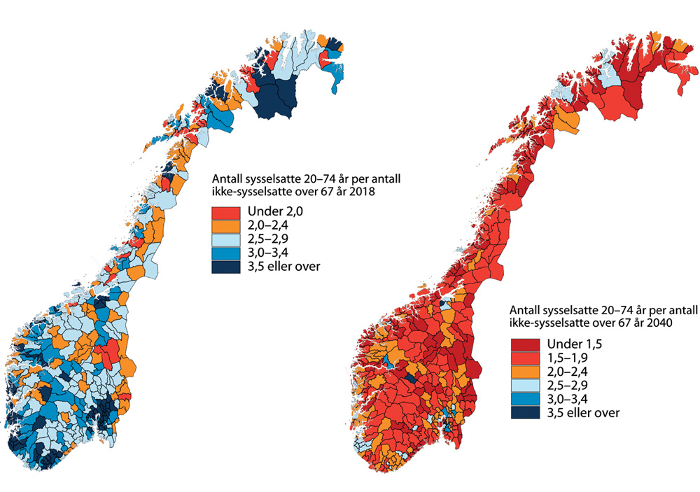 Aldersbæreevnen beregnes gjerne ved å se på forholdet mellom befolkningen i yrkesaktiv alder (20–66 år) og den eldre delen av befolkningen (over 67 år). Men selv om sysselsettingsandelen i Norge er relativt høy (se også neste avsnitt), er en fjerdedel i alderen 20–66 år ikke i arbeid. Samtidig er også en sjettedel mellom 67 og 74 år sysselsatt. Når en tar hensyn til dette i beregningen av aldersbæreevnen, var det i Norge i 2018 3,5 sysselsatte personer (i alderen 20–74 år) per pensjonist (ikke-sysselsatte personer over 67 år). De minst sentrale kommunene i landet og kommuner med under 3000 innbyggere har betydelig lavere aldersbæreevne, med kun 2,5 sysselsatte per pensjonist. I 2040 vil det være 2,2 sysselsatte per pensjonist for landet som helhet og 1,7 sysselsatte per pensjonist i de mindre sentrale kommunene (sentralitet 5 og 6), gitt de forutsetningene som fremgår i note til Figur 3.6.