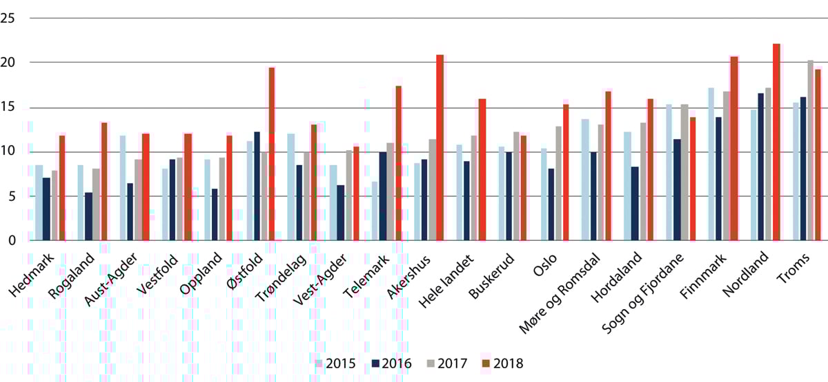 Over flere år har virksomheter rapportert om mangel på arbeidskraft med relevant kompetanse. I NHOs Kompetansebarometer for 2018 svarte 6 av 10 bedrifter at de har et udekket behov for kompetanse. Denne andelen har vært relativt stabil de siste fem årene. NAVs bedriftsundersøkelse for 2019 viser at andelen virksomheter som har mislyktes i å rekruttere arbeidskraft, eller som har måttet ansette noen med annen eller lavere kompetanse, har økt mellom 2018 og 2019. I NAVs regioninndeling er det nå i vestre Viken, Oslo, Troms3 og Nordland at vi finner den høyeste andelen virksomheter som oppgir å ha hatt rekrutteringsvansker de siste tre månedene. Rekrutteringsproblemene er minst i Agder, Trøndelag og Innlandet. De siste årenes nedgangstider i oljebransjen preger ikke lenger arbeidsmarkedet i like stor grad, og der Rogaland hadde den laveste andelen virksomheter med rekrutteringsproblemer for to år siden, så ligger fylket nå omtrent på landsgjennomsnittet. Målt i antall personer, er mangelen på arbeidskraft høyest i Oslo, mens Stramhetsindikatoren viser at mangelen er høyest i Nordland og Troms4. Sammenliknet med for ett år siden har mangelen økt i alle fylker/regioner, bortsett fra Trøndelag som har en liten nedgang. Ser vi på utviklingen over tid mellom årene 2015–2018 så er det særlig virksomheter i de nordnorske fylkene som har rapportert om en vedvarende mangel på kompetanse, jf. Figur 3.7. NAV har endret regioninndelingen i 2019-undersøkelsen og vises derfor ikke i denne figuren.
