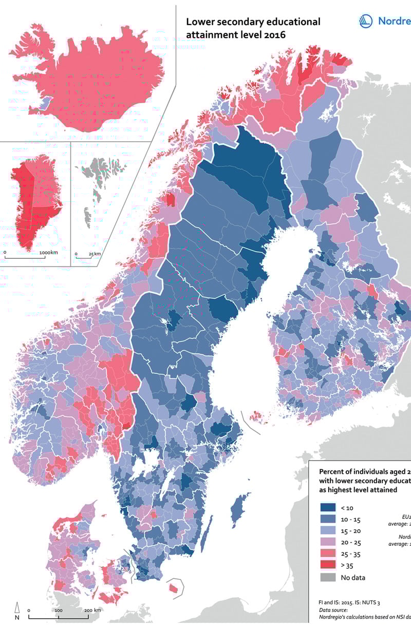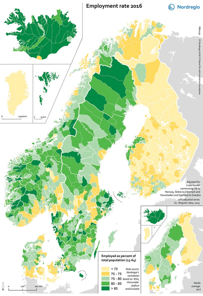 Figur 3.8 viser andelen av befolkningen med kun grunnskole. Figur 3.9 viser sysselsettingsandelen av befolkningen for kommuner i de nordiske landene. Det er en tendens til at kommuner hvor en høy andel av befolkningen kun har grunnskole også har en lavere sysselsettingsandel. I Norge finnes slike kommuner på Østlandet inn mot svenskegrensen og ned mot Sørlandet, og i mindre sentrale kommuner i Nord-Norge, spesielt i Finnmark. Tendensen er imidlertid ikke entydig, og man finner også eksempler på kommuner hvor mange kun har grunnskole, men hvor sysselsettingen likevel er høy. Dette reflekterer regionale og lokale ulikheter i næringsstruktur og næringers ulike krav til formell kompetanse. Vi ser også at en rekke mindre sentrale kommuner i Sverige og Finland har lave andeler med personer med kun grunnskole, og i Sverige har de samme kommunene høye sysselsettingsandeler. Finland har generelt lavere sysselsettingsandeler enn de øvrige nordiske landene.