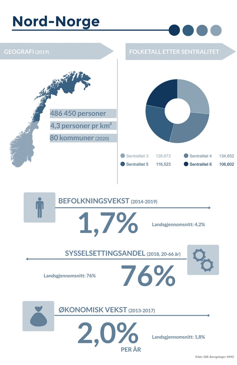 Nord-Norge – Finnmark, Troms og Nordland – har hatt befolkningsvekst i perioden 2014–2019 på 1,7 prosent, og ved inngangen av 2019 var det nærmere en halv million innbyggere i landsdelen. Innvandring er den største forklaringen på befolkningsveksten, men landsdelen har også et fødselsoverskudd. Imidlertid er det flere som innenlands flytter ut enn inn i landsdelen, og mange distriktskommuner preges av aldring av befolkningen. I perioden 2013–2017 har andelen bosatte med høyere utdanning i landsdelen økt fra 24,7 prosent til 28,3 prosent.