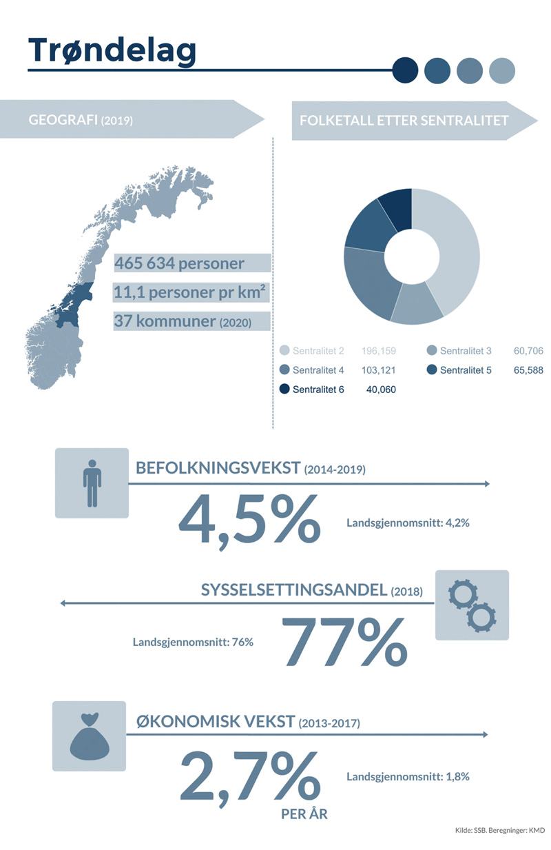 Regjeringen har gjennom Plan for lokalisering av statlige arbeidsplasser fattet beslutning om utflytting og nyetablering av statlige arbeidsplasser i Trøndelag for å utnytte den kompetansen som finnes i landsdelen, og for å styrke regionale arbeidsmarkeder. Dette gjelder blant annet Sykehusbygg HF (Trondheim), Norsk kulturråd (Trondheim), UNIT – kvalitet og internasjonalisering i høyere utdanning (Trondheim) og Landbruksdirektoratet (Steinkjer). Trøndelag er med 14,0 prosent av sysselsettingen i statsforvaltningen den landsdelen med nest høyest andel av arbeidsplassene i statsforvaltningen. I perioden 2013–2018 økte antall statlige arbeidsplasser i landsdelen med 10,4 prosent, som er høyest i landet.