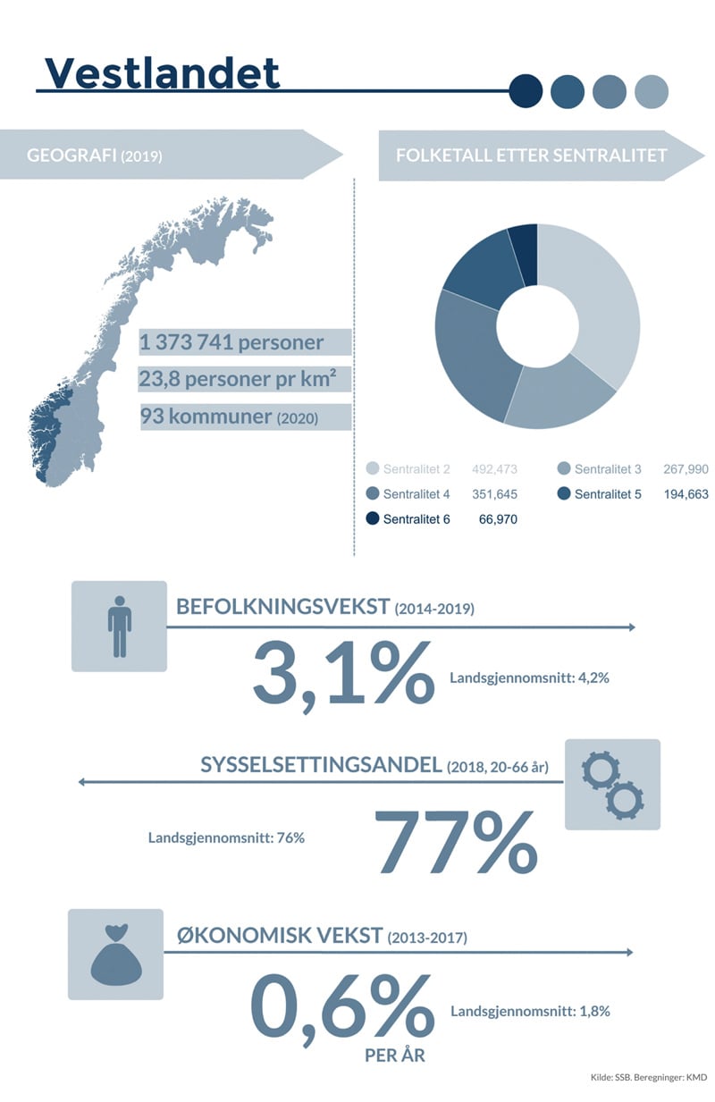 Vestlandet – Møre og Romsdal, Sogn og Fjordane, Hordaland og Rogaland – har hatt befolkningsvekst på 3,1 prosent i perioden 2014–2019. Innvandring og fødselsoverskudd bidro til befolkningsveksten, mens det er flere som flytter til andre norske landsdeler enn det som kommer tilbake. I perioden 2013–2017 har andelen bosatte med høyere utdanning i landsdelen økt fra 27,9 prosent til 31,6 prosent.