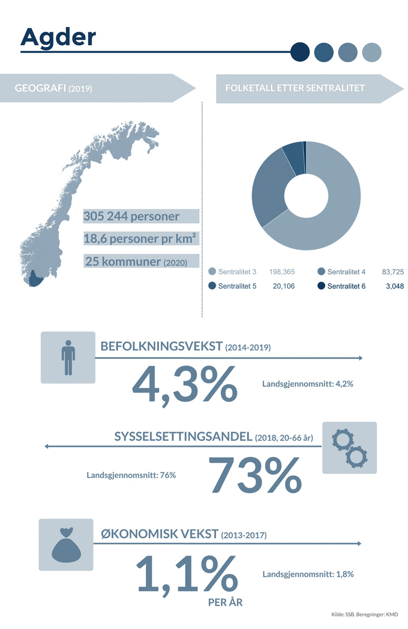 Regjeringen har gjennom Plan for lokalisering av statlige arbeidsplasser fattet beslutning om utflyttinger. Nye Veier AS er etablert i Kristiansand for å bruke den kompetansen som finnes i landsdelen, og for å styrke regionale arbeidsmarkeder. I Agder er 9,7 prosent av sysselsettingen i statsforvaltningen, som er noe under landsgjennomsnittet. I perioden 2013–2018 økte antall statlige arbeidsplasser med 10,1 prosent, som er nest høyest blant landsdelene.