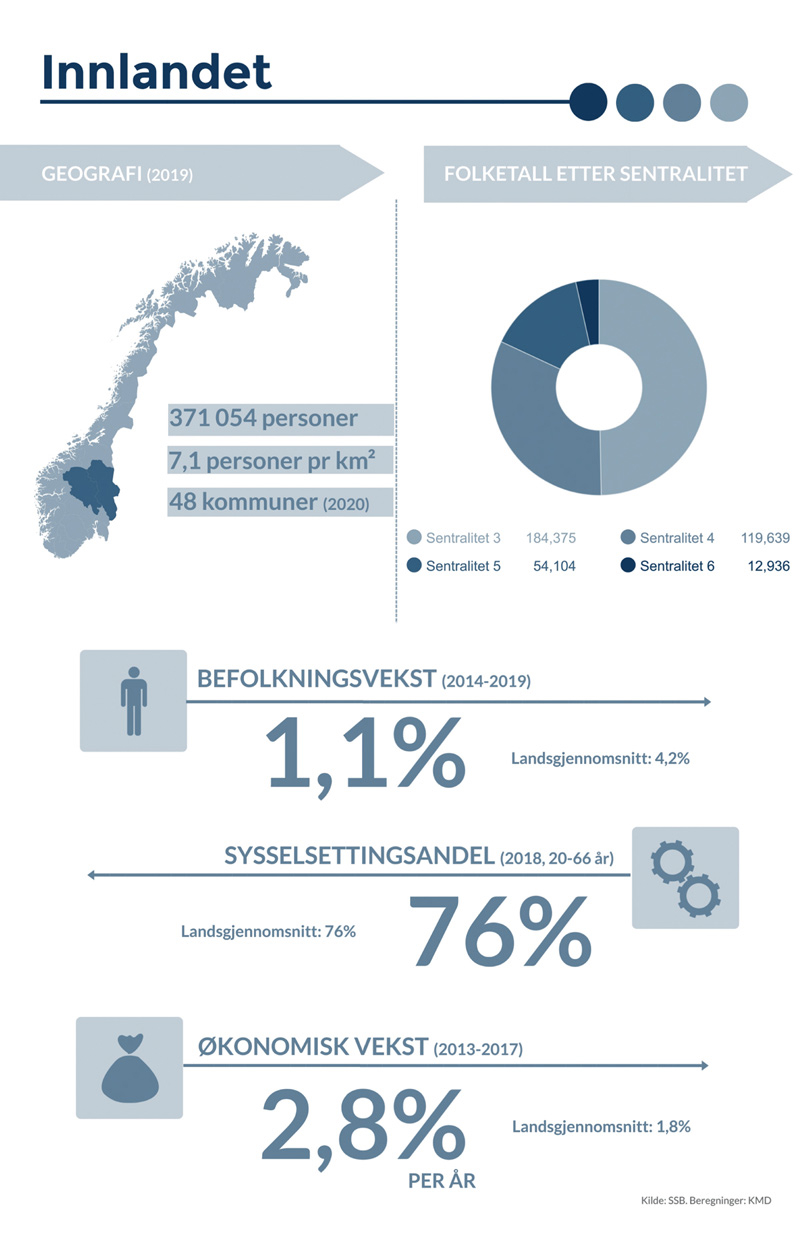 Befolkningsveksten i Innlandet var 1,7 prosent i perioden 2014–2019. Befolkningsveksten kom fra innvandring, mens landsdelen hadde negativ netto innenlandsk flytting og fødselsunderskudd. I perioden 2013–2017 har andelen bosatte med høyere utdanning i landsdelen økt fra 22,6 til 25,7 prosent.