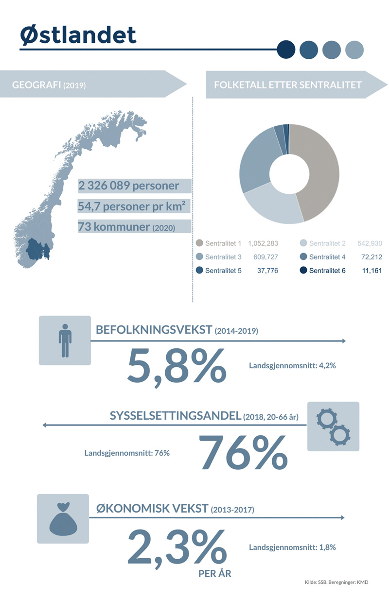 Østlandet – Vestfold, Telemark, Buskerud, Akershus, Oslo og Østfold – har hatt en befolkningsvekst på 5,8 prosent i perioden 2014–2019. Befolkningsveksten kommer som et resultat av både innvandring, fødselsoverskudd og innenlandsk flytteoverskudd. I perioden 2013–2017 har andelen bosatte med høyere utdanning i landsdelen økt fra 32,7 til 37,2 prosent.