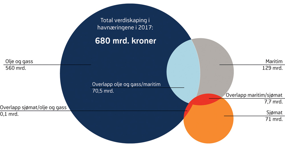 Olje- og gassnæringen er Norges største havnæring med en verdiskaping på 560 mrd. kroner i 2017. Olje- og gassnæringen er en viktig kilde til velferd, arbeidsplasser og utvikling av banebrytende teknologiske løsninger som også tas i bruk i andre næringer. Havbunnen rommer rike olje- og gassressurser som har bidratt til å legge grunnlaget for velferdssamfunnet. Norge er også en betydelig skipsfartsnasjon og den maritime næringen er en viktig del av norsk næringsliv. Næringen består av rederier, verft og utstyrs- og tjenesteleverandører. En langstrakt kyst, høy kompetanse og innovasjonskraft legger grunnlaget for en stor maritim næring og arbeidsplasser i alle deler av landet. Næringen er samtidig svært internasjonal og har en høy eksportandel. I 2017 stod maritim næring for 129 mrd. kroner i verdiskaping uten ringvirkninger. Antall sysselsatte var om lag 85 000 personer. Verdiskapingen i sjømatnæringen inklusive ringvirkninger var på 71 mrd. kroner i 2017. Sjømatnæringen er derfor blant de viktigste fremtidsnæringene for Norge. I et globalt perspektiv er særlig akvakultur viktig for å kunne møte behovet for mat til en økende verdensbefolkning, og Norge kan bidra med både teknologi og kunnskap.